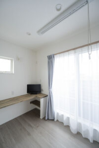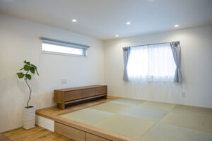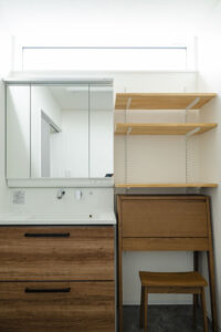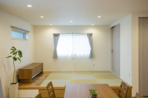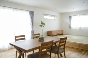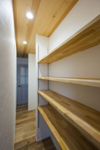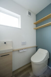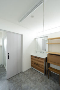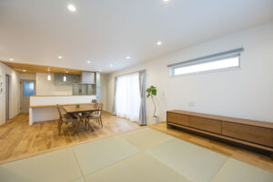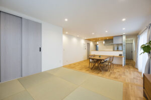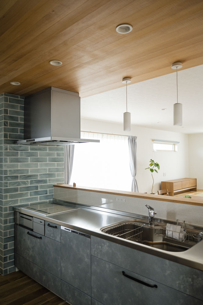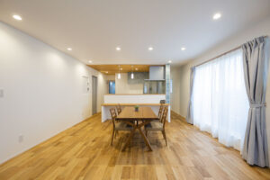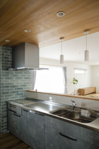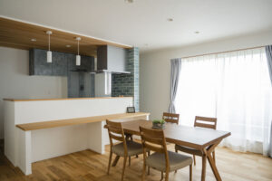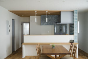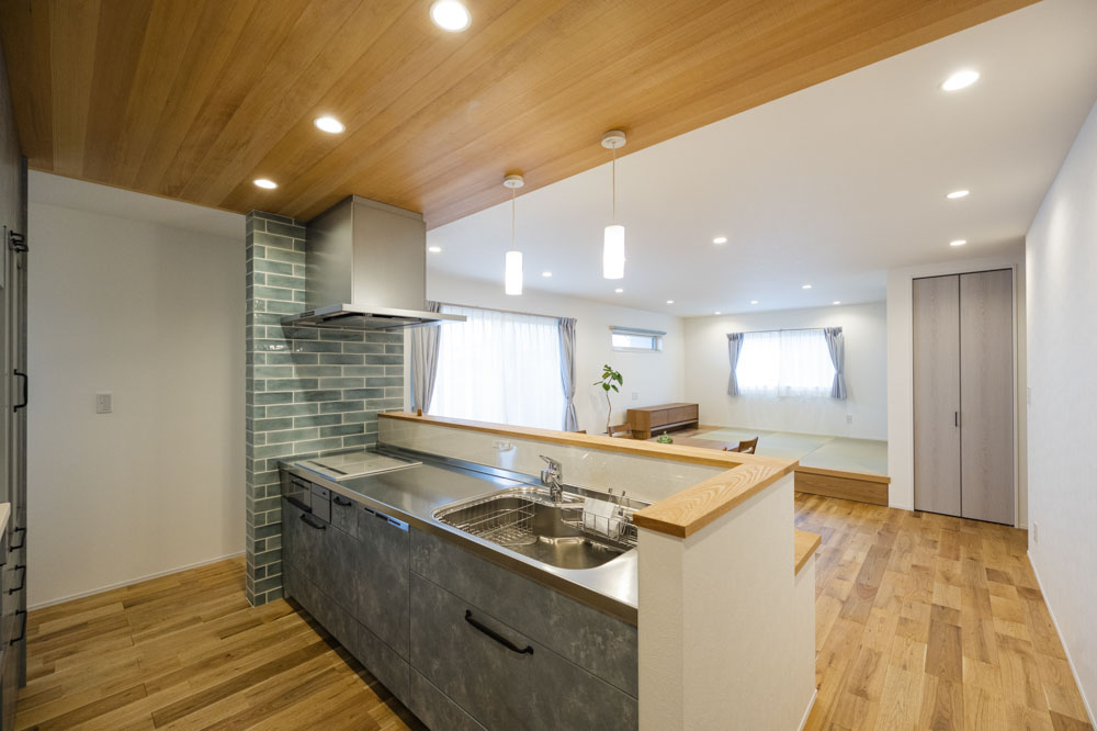 DATA カテゴリー / 新築(2023年) 施工事例 / 北欧風・家事動線にこだわった新築 地域 / 今治市上徳 築年数 / リフォーム面積 / 234.34㎡ 間取り / 工期 / 2022.4~2023.1(約9カ月) 家事動線にこだわられていた施主様。お風呂から洗面・家事室・ベランダまで一直線に行けるような仕様にしました。 LDKの床材に無垢のクルミを使い、一部の天井には米栂を使うなど本物の木材を取り入れ温かみのある雰囲気に。 キッチンのフード横の壁はアクセントにタイルを使いました。 長期優良住宅の認定を取得