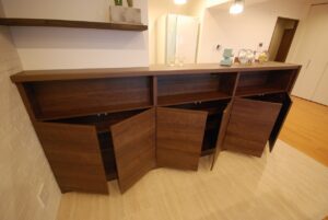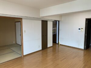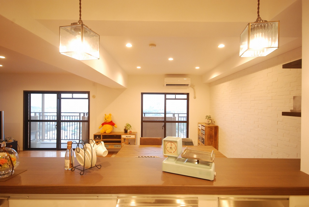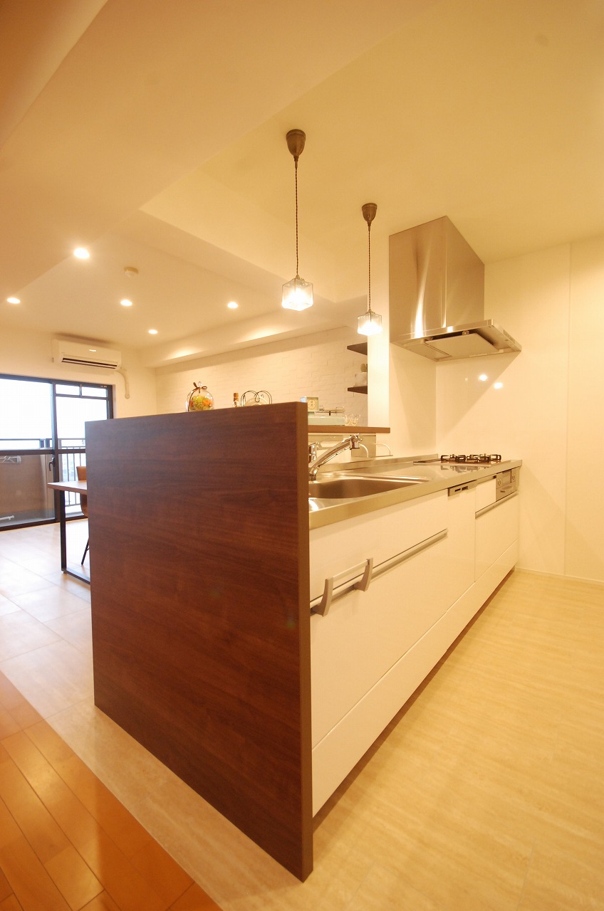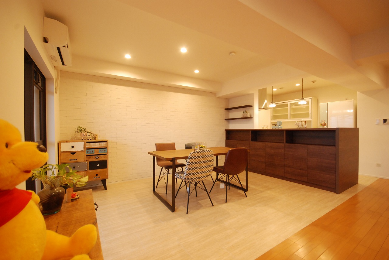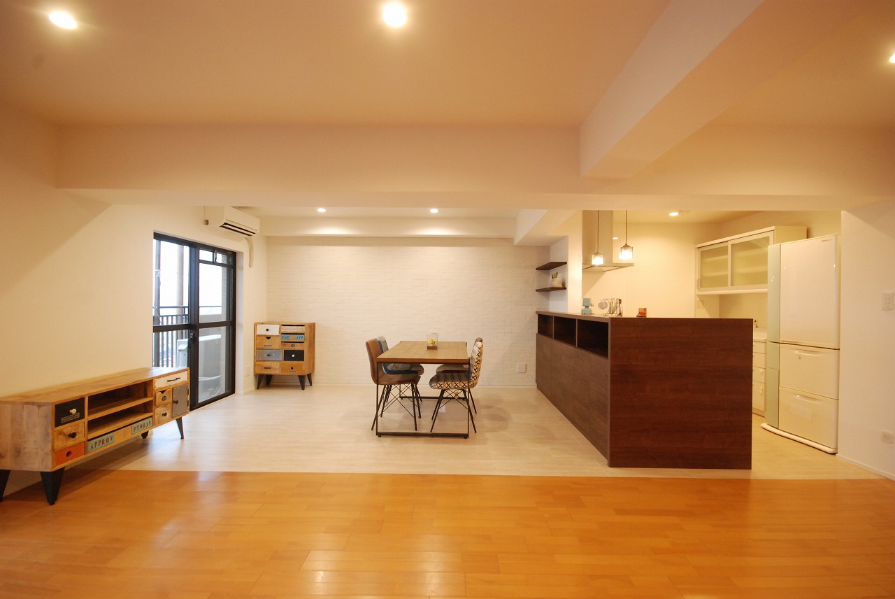 DATA カテゴリー / マンションリフォーム 施工事例 / LDKリフォーム 地域 / 今治市 築年数 / リフォーム面積 / 約20㎡ 間取り / 工期 / 2020年(約2カ月) マンションのLDKをリフォームしました。 改装前は独立した個室だったキッチンを、和室を取り込むことで、奥様ご希望の“広々とした対面キッチン”へと一新しました。 造作カウンターは収納力も抜群です。 壁面には一面にエコカラットを採用し、空間のアクセントに。 エコカラットはデザイン性に加えて、調湿・消臭効果があり、お手入れも簡単なためとてもおすすめの素材です。 施工前 施工後
